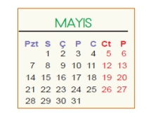 - Günler: Pazartesi, Salı, Çarşamba, Perşembe, Cuma, Cumartesi, Pazar.